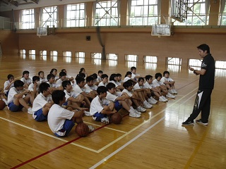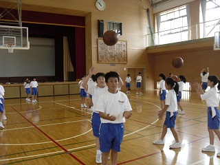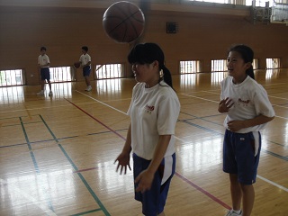 1A:保健体育では、バスケットボールの授業です。後ろから飛んできたボールを、「ボールを感じる力」をはたらかせてキャッチしています。投げる人の技術も必要です。さあ、上手く取れたでしょうか。