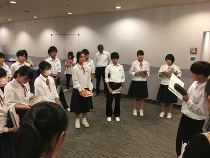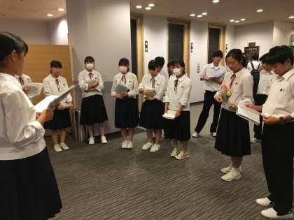 時間を意識して行動すること、リーダーとして想像力を働かせて行動することの2点の話が学年主任からありました。また、朝からよく頑張りましたというお褒めの言葉もありました。安全で楽しい修学旅行の第2日目も、頑張りましょう。明日は、班ごとの自主研修です。