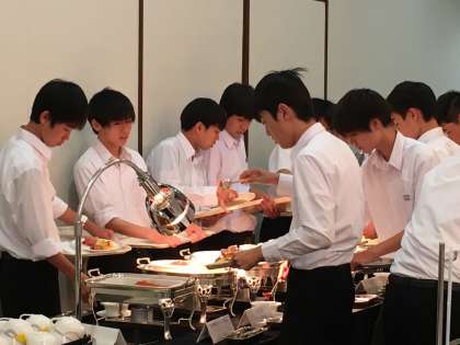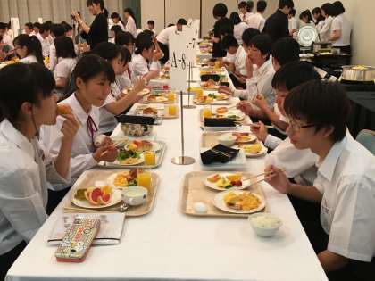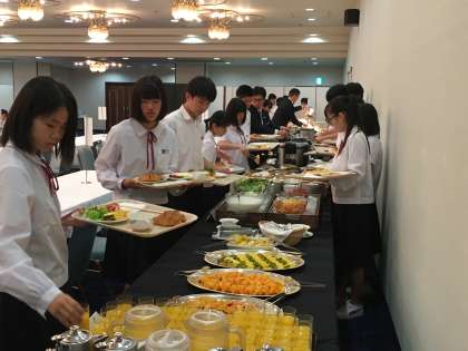 3年A.B組です。バイキング形式で、パンやご飯など好きなものを選んで食べます。