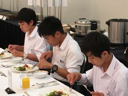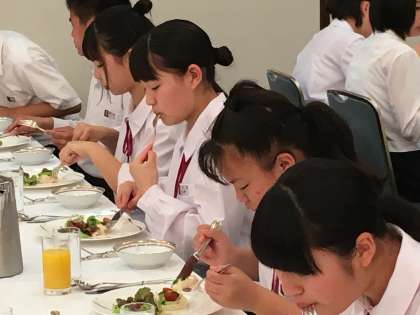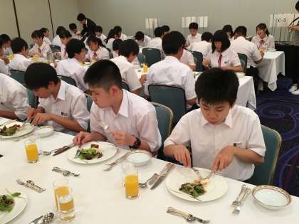 二日目の夕食は、フルコースの料理です。ホテルの方にフォークとナイフの使い方の説明を受けて、食事が始まりました。前菜のサラダの盛合せをフォークとナイフを使って、とても上手に食べています。写真は、A.B.C組です。