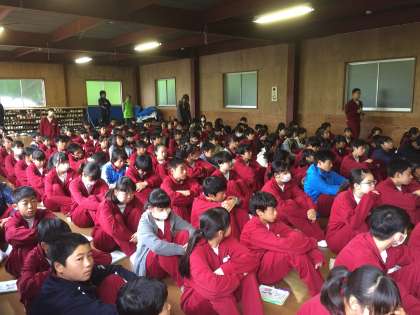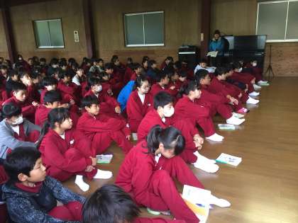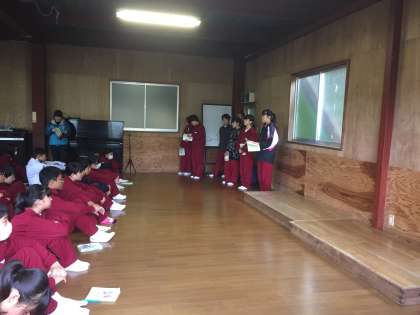 おはようございます。昨日の夜の雨で広場が濡れているため、室内で朝の集いを行いました。