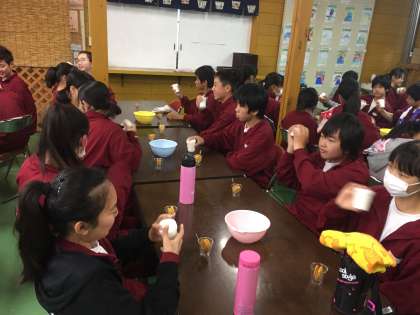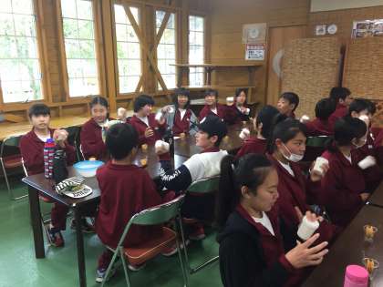 西湖からの帰りにミルクランドによりました。バター作り体験の様子です。五分くらいでバターができるようです。フリフリしています。