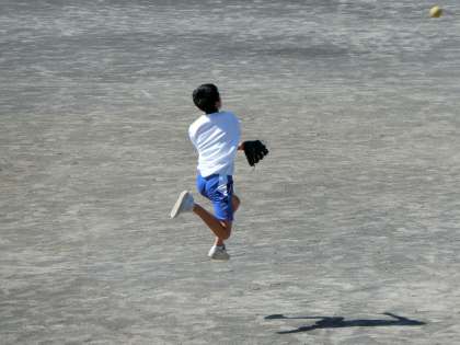 3年D組は、爽やかな秋空の下、ソフトボールを楽しんでいます。バッティングや守備でよい動きをしていた3人をパチリ!