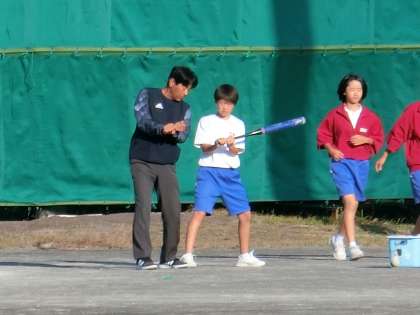 今朝も秋晴れのスタートです。グランドでは、ソフト部が朝のトレーニングを行っています。室伏先生が丁寧にバッティングの指導を行っています。