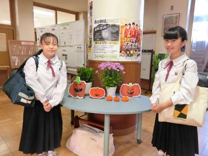 職員玄関前には、美術部のパンプキンの作品が並び、秋の彩りを添えています。通りかかった3年生をパチリ!