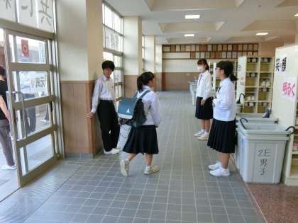 生徒玄関では、2年生学年委員があいさつ運動を行っています。爽やかな一日になりそうです。