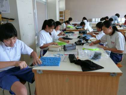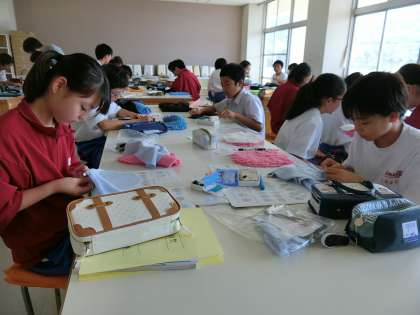 1年C組家庭は、マイクロファイバーのクリーナーづくりを行っています。刺繍糸を使って上手にできるといいですね。