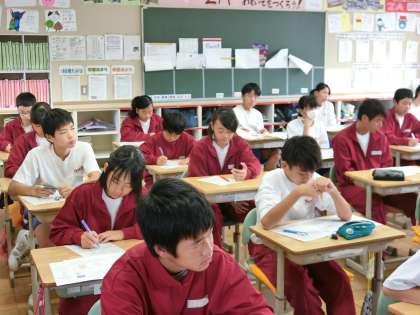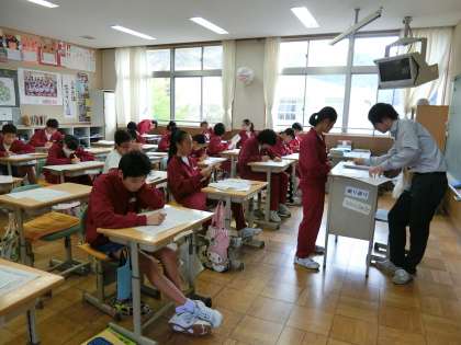 2年A組理科は、テスト解説を行っています。 2年B組社会は、テストを配っています。