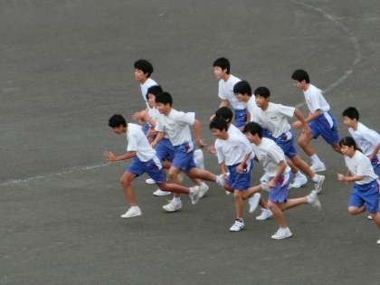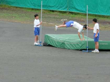 2年C組保体は、ダッシュの準備運動をした後、走り高跳びの練習をしています。男子は、ベリーロールに挑戦している生徒が多いです。