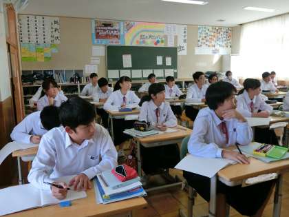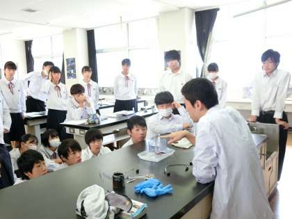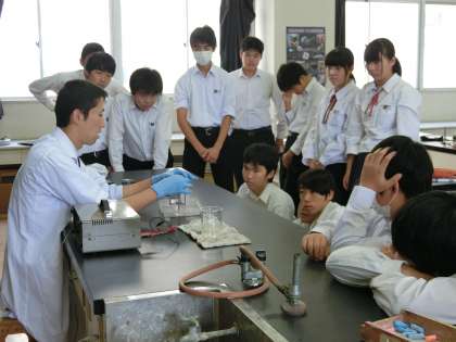 3年E組理科は、塩酸の電気分解の師範実験を見ています。電流を通したとき、驚きの声が聞こえました。