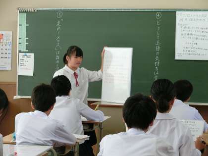 2年E組国語は、「走れメロス」の学習課題で、グループで考えたことを代表が発表しています。