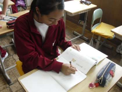 2E道徳:今日で転出する出雲萌果さんです。最後の道徳の授業を受けていました。三中での思い出を胸に、転出先でも頑張って下さい。