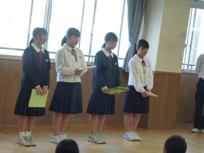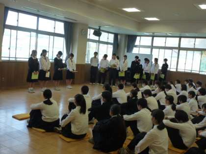 3年生は多目的ホールで行っていました。学年委員が決めた、後期学年目標「光」〜学年の華を咲かせるために〜の説明と、各担当からの後期の取り組みを話していました。