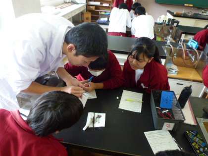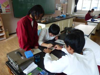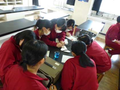 3Cは理科の授業です。「塩化銅の電気分解」を行っていました。実験として、銅を乳棒を使ってすりつぶしていました。先生も手伝っています。