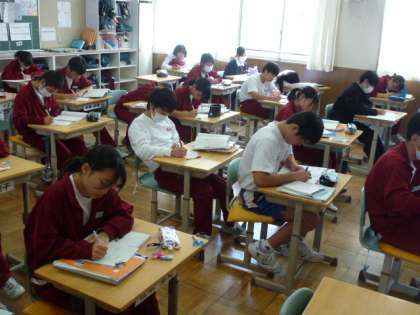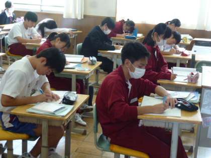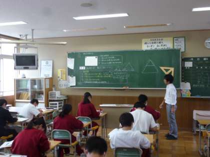 3Dの授業は数学でした。「相似条件を使って、相似な三角形を見つけよう」の授業を行っています。条件をそろえ見つけることが難しいです。