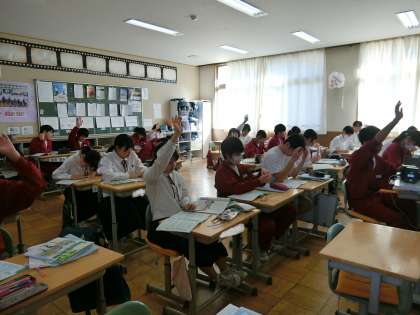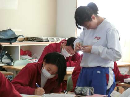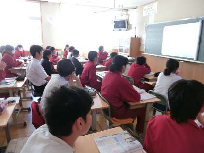 3年D組英語は、関係代名詞のまとめをしています。質問の答えを発表しようと、意欲的です。