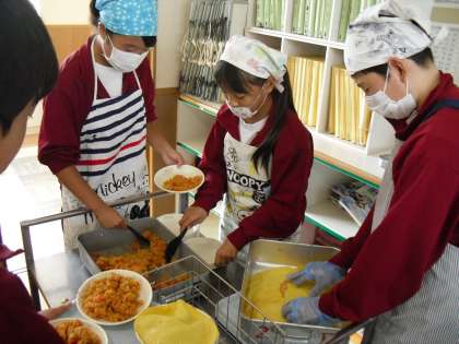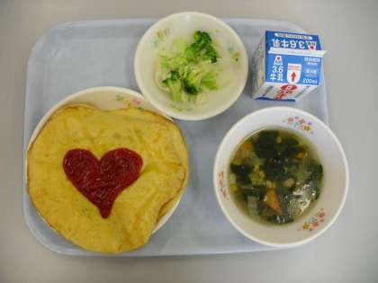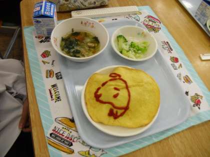 オムライスは、配膳するときに卵が破れやすいので大変ですが、手際良く配膳していました。写真は2年E組です。ケチャップで可愛い絵を描いて楽しそうに食べていました。