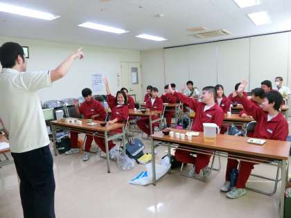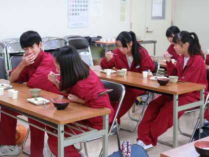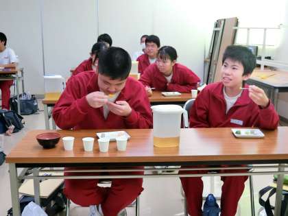 写真は、「介護老人福祉施設おおひら」にて、始めに職員の皆さんが講義をしてくださっています。飲み込む力が弱い方のための食事の試食ですが、実際に食べて、何の味か言い当てています。8種類の、1cmくらいのサイコロ型のゼリーを試食していますが、なかなか当たらないようです。生徒のために準備してくださって、本当にありがたいです。