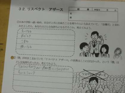 1A道徳:「リスペクト アザース」という資料を用いて、人権について考えました。「リスペクト アザース」とは、直訳すると「他の人を尊敬しなさいと」という意味です。