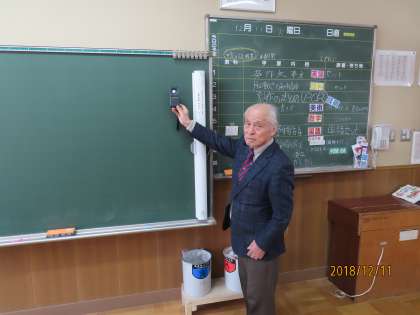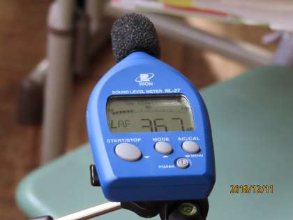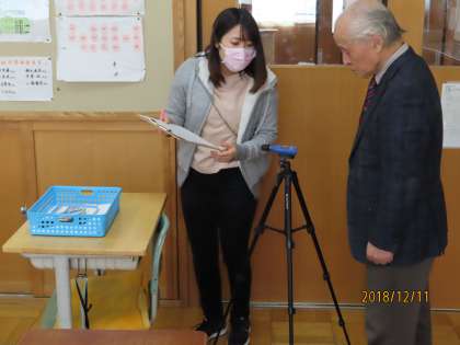 学校薬剤師の荻生昌平先生が照度計で蛍光灯の明るさを、騒音計で教室内の音(窓を開けたときと閉めたとき)を計測しています。