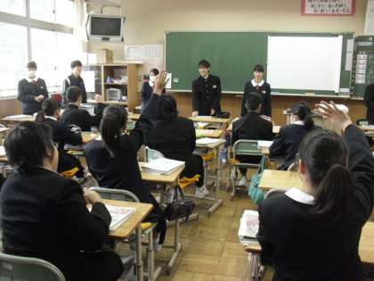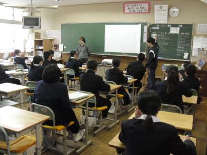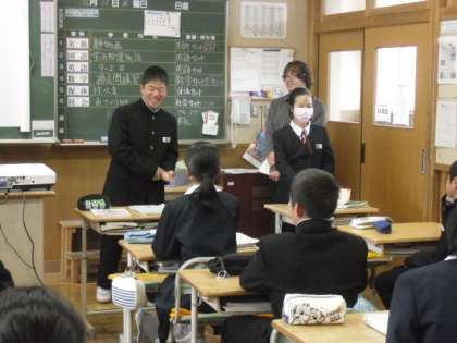 1B英語:ALTのクリス先生が中心となって授業を行いました。導入は、ジェスチャーゲームです。最初のお題は「すし」。寿司を握っている様子、食べている様子などそれぞれのジェスチャーから、答えていきました。とても盛り上がっていました。