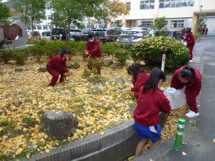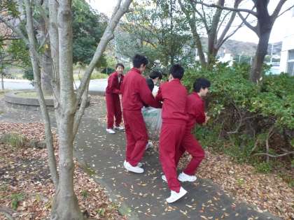 昨日と今日の昼休み、整備委員会主催の落ち葉拾いコンテストが行われました。多くの落ち葉を集めたチームが優勝するコンテストです。2日間にかけて行われた様子です。