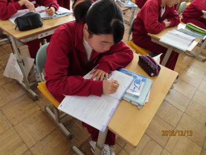 2Eは英語の授業でした。英文(長文)の読み取りをしていました。塚本先生が全員がよく見えるように、椅子の上にのって英語を読んでいました。