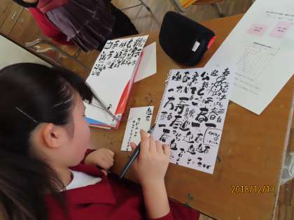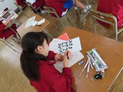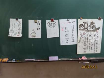3Dは美術です。年賀葉書の様な作品作りをしています。いろんな書体で文字を表していました。