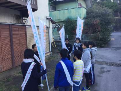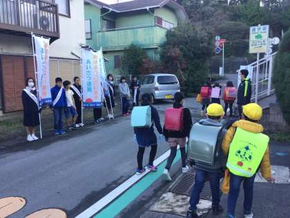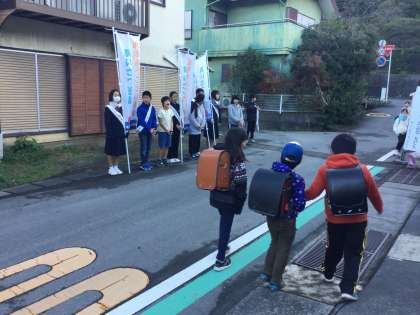 12月14日(金)三小・香貫小で小学生とともにあいさつ運動を実施しました。本年度最後のあいさつ運動です。写真は香貫小(歩道橋下)でのようすです。