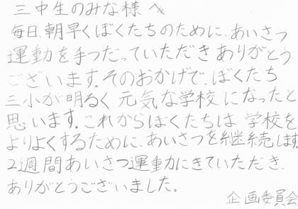 三小は校門前で実施しました。三小の企画委員さんからお礼のお手紙をいただきました。朝早くからありがとうございました。