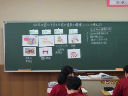 3Fは家庭科でした。「幼児の遊びを支える遊び道具と環境について考えよう」を学習していました。おもちゃの役割は何?と考えているところでした。