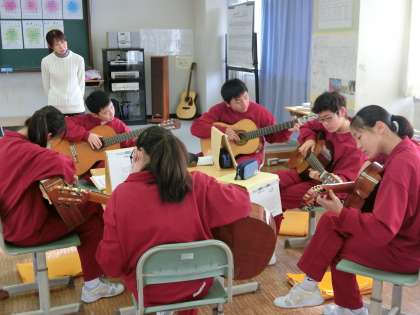 1年C組音楽は、「かえるのうた」を使って、ギターでのグループアンサンブル発表を行なっています。