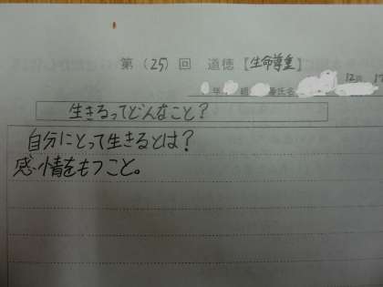 1年D組道徳は、「行きるってどんなこと」というテーマで、生命尊重について考えています。それぞれの「生きる」ってどんなことか、よく考えてワークシートに書いています。