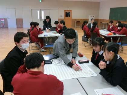 3年F組社会は、ソニー生命の皆さんが講師になり、ライフプランニングの授業を進めています。自分の目指す道には、どの位お金がかかるのか、どんなコースを歩もうとしているのかなど、話し合い、アドバイスをいただく学習です。皆、興味を持って取り組んでいます。