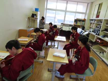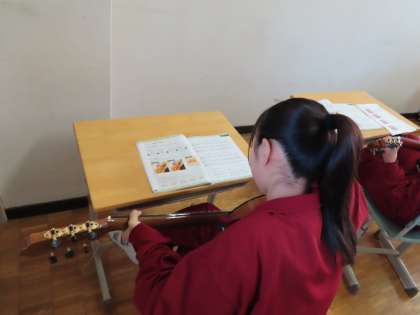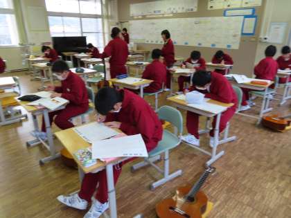 3Eは音楽です。ギターのテストで「カントリーロードのストロークテスト」をしていました。みんな上手に弾けています。準備してでテスト、教室はプリントと練習をしていました。