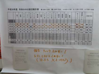 部活動もあと2日 公開日 2018/12/27 更新日 2018/12/27 学校の紹介 冬休み中の部活動は5日間しかありません。年末年始のお休みに土日があるため冬休み16日間もあるのに少ないです。少ない時間でがんばって活動しています。予定は写真の通りです。 いいね(0)