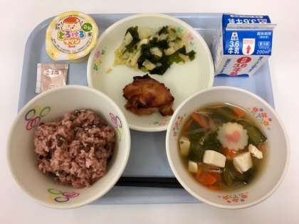 ・お赤飯・ごま塩・牛乳・鶏肉のみそ焼き・キャベツとわかめの和え物