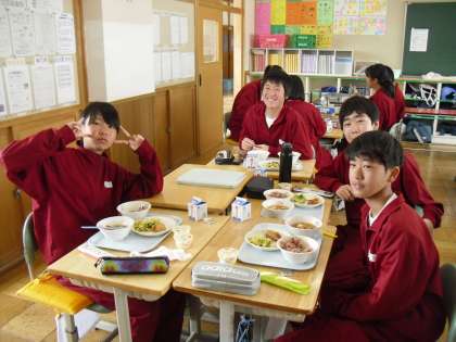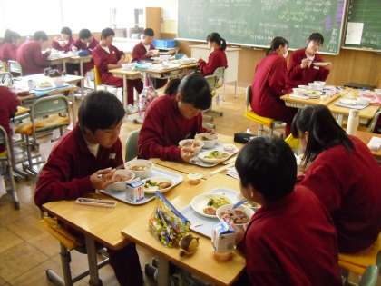 今日の給食は、1年生の入学、2・3年生の進学をお祝いしてお赤飯でした。写真は3年D組、E組です。