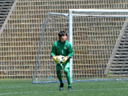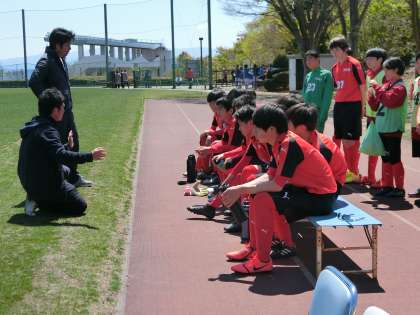 前半イレギュラーなボールが入り、0−1となりますが、ゴールキーパーが守護神として頑張っています。前半を終え、監督の指示を受けています。