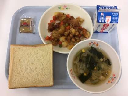 ・食パン・牛乳・鶏肉とじゃが芋の揚げ煮・春キャベツのスープ