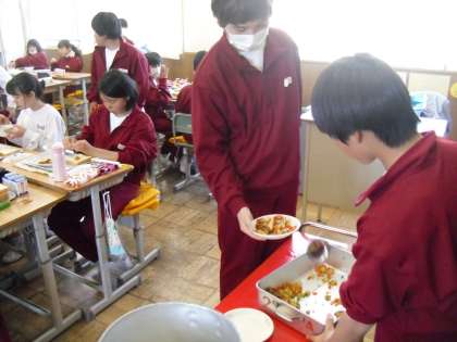 鶏肉とじゃが芋の揚げ煮は給食の人気メニューです。写真はいつもきれいに食べてくれている2年A組です。