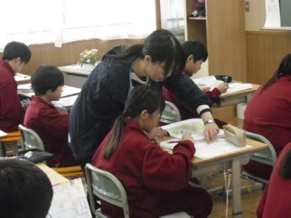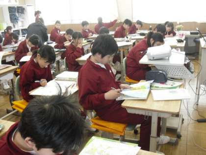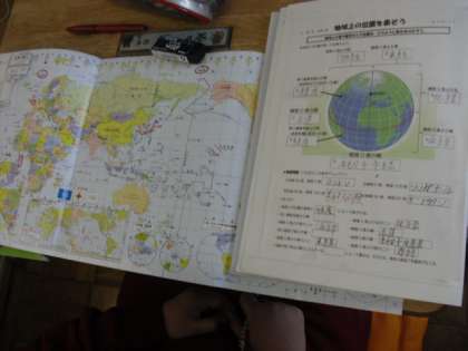 1B社会:「地球上の位置をあらわそう」という課題の元、学習に取り組んでいます。球形の地球の位置を表すためには、どうすればいいのか、「経線」「緯線」とは何なのか。初めて聞く言葉が多くて戸惑っていましたが、自分たちで地図帳を調べて、一生懸命考えていました。