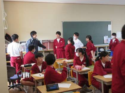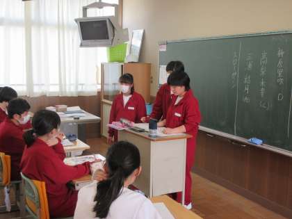 食事・保健係のスローガンは「マナーを守って健康に!」です。食事計画、事前健康調査、当日の健康チェック、ゴミの処理計画、入浴時の決まり等、集団の宿泊行事をするうえで重要な仕事です。