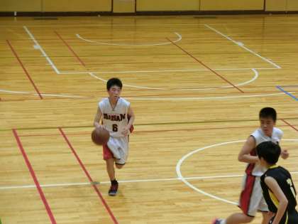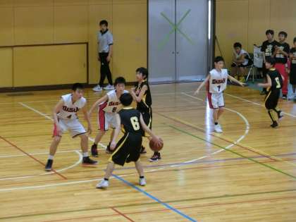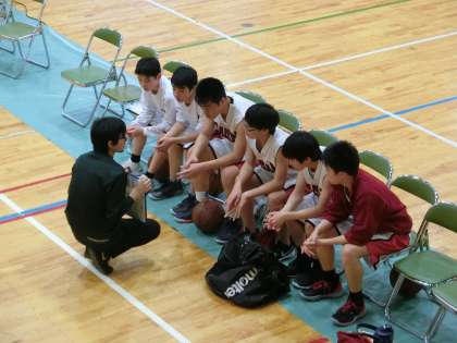 各地区に分かれて開催される東部選手権大会に、本校バスケット部男子が出場しました。吉原第一中学校と初戦であたりました。はじめから、オフェンス、ディフェンスとも全力で戦い、シーソーゲームのスタートとなりました。タイムでは、顧問のアドバイスに、しっかり耳を傾けています。1セット目は、8−6で優勢です。