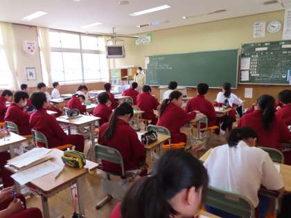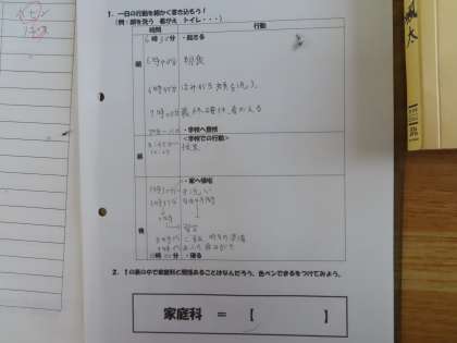 1A家庭科:「生活と家庭科」朝起きてから、夜寝るまでの一日の行動を振り返りました。その中から家庭科に関係ある活動はどんな活動か考えていきました。
