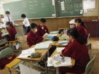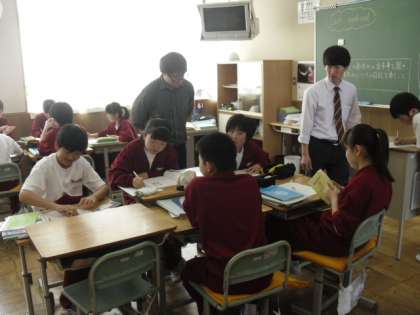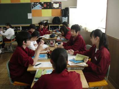 2C英語:学習課題「クリス先生の春休みの出来事を聞き、自分の春休みについての日記を書くことができる」班で、春休みの出来事を考えていました。英文にするためにお互いに意見交換をしています。