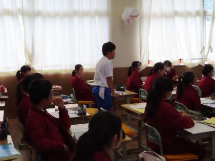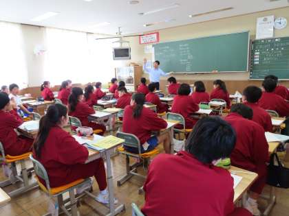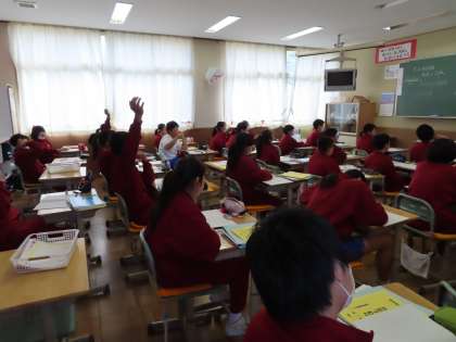 2A数学:単項式の乗除について学習していました。「3a×2b」の計算結果として、「5ab」「3a2b」などとしたとき、どんな意図でそうなったのかを考えていました。簡単な計算が奥が深いものになっていました。生徒も一生懸命考え、わかった人は意欲的に発言していました。
