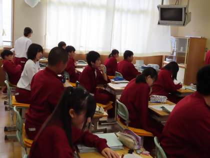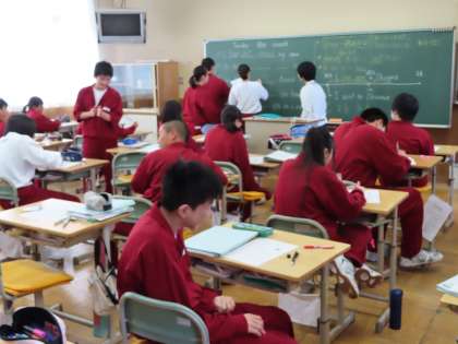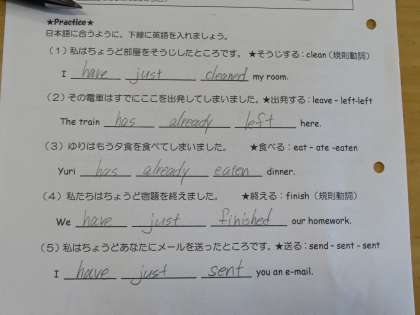3E英語:「過去分詞」について学習しています。数直線を用いて、過去、現在、未来を表し、過去分詞を用いた文は、どの部分を表しているのか考えています。視覚的で効果により、理解している生徒が多かったです。
