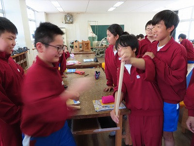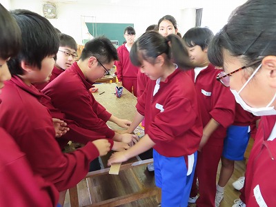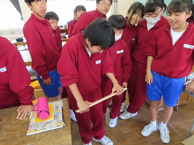 1E技術:木材の繊維方向に垂直に力を加えて、おることができるかどうか試しています。なかなか大変そうです。木って丈夫ですね。体験することの大切さを実感しました。