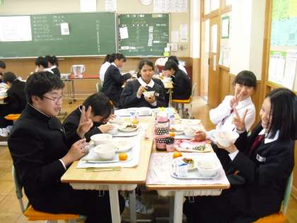 今日はふるさと給食の日といい、地元の食材を使用した給食でした。沼津産のお茶を使って炊いたご飯と冷凍みかんは西浦の寿太郎みかんを使っています。写真は1年E組です。